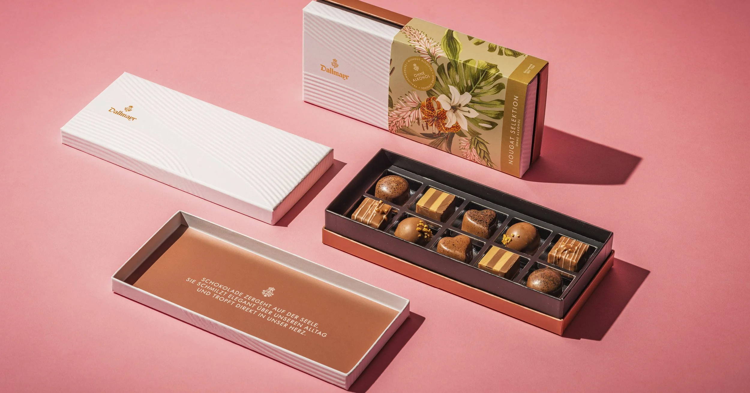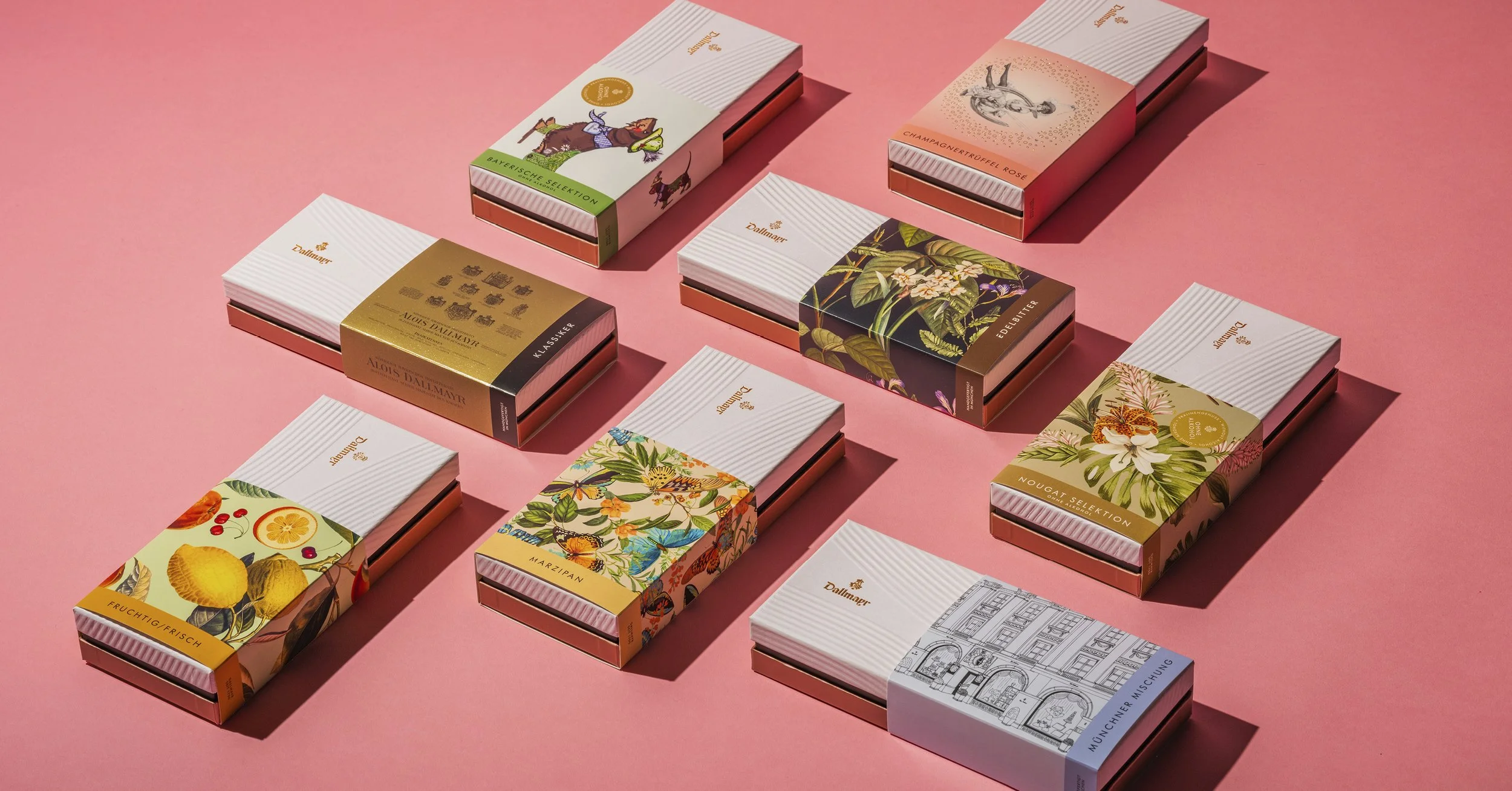 The latest redesign of the praline packaging brings everything together. The pralines are made in their own manufactory with the finest ingredients and craftsmanship — the result: a true delight. The packaging is of the highest quality and modular in design. Each flavor has its own banderole — ranging from classic to modern.